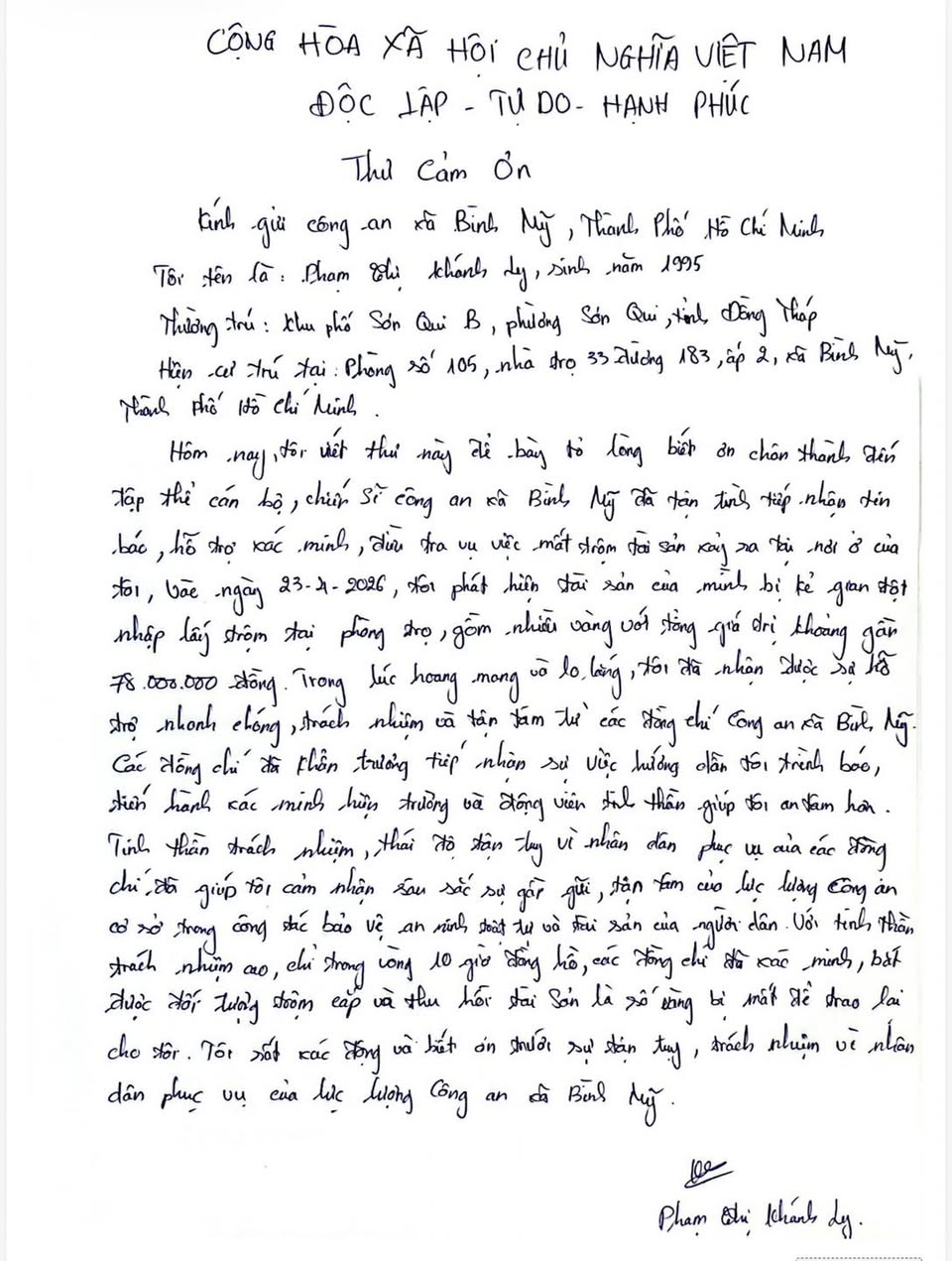 Nhận lại tài sản trong thời gian ngắn, chị Ly xúc động gửi thư cảm ơn, đánh giá cao sự tận tụy, gần gũi và tinh thần vì Nhân dân phục vụ của lực lượng công an cơ sở.