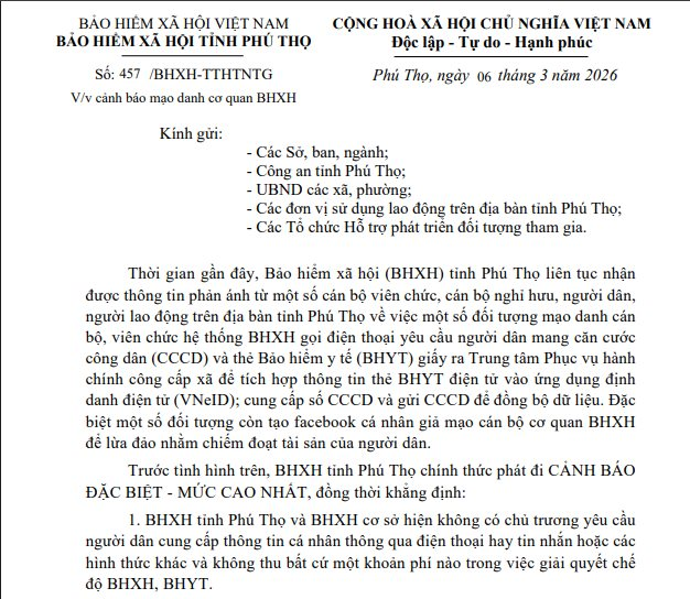 Trước tình hình trên, BHXH tỉnh Phú Thọ đã ban hành Công văn số 457/BHXH-TTHTNTG về việc cảnh báo hành vi mạo danh cơ quan BHXH.