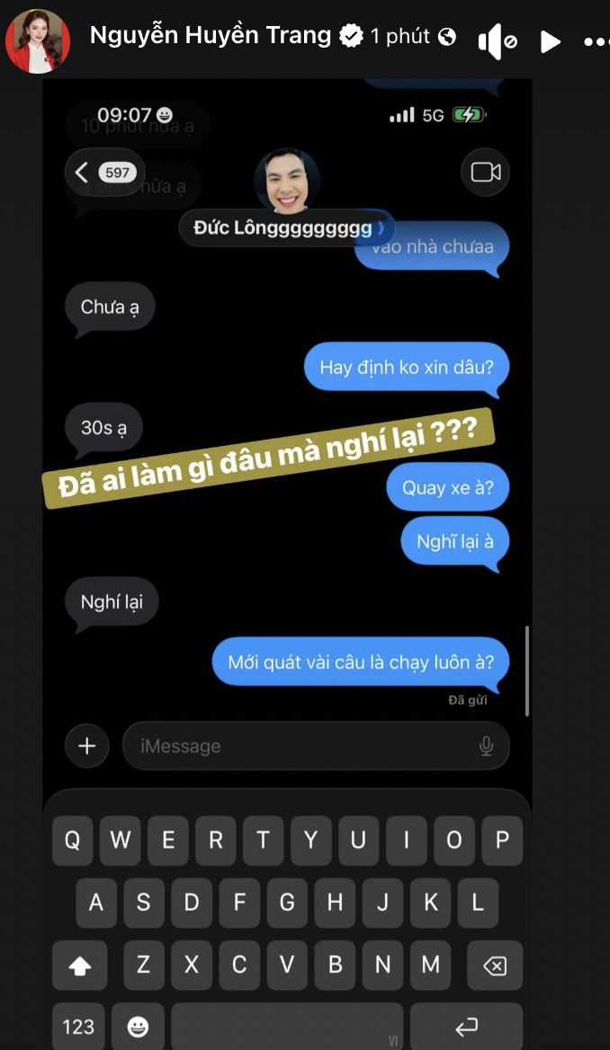 Trên story cá nhân, nữ MC chia sẻ ảnh chụp màn hình cuộc trò chuyện giữa hai người. Khi cô hỏi chồng "v ào nhà chưa?” , Đức Huy trả lời rằng mình “chưa” và nói cần thêm “30 giây nữa” .