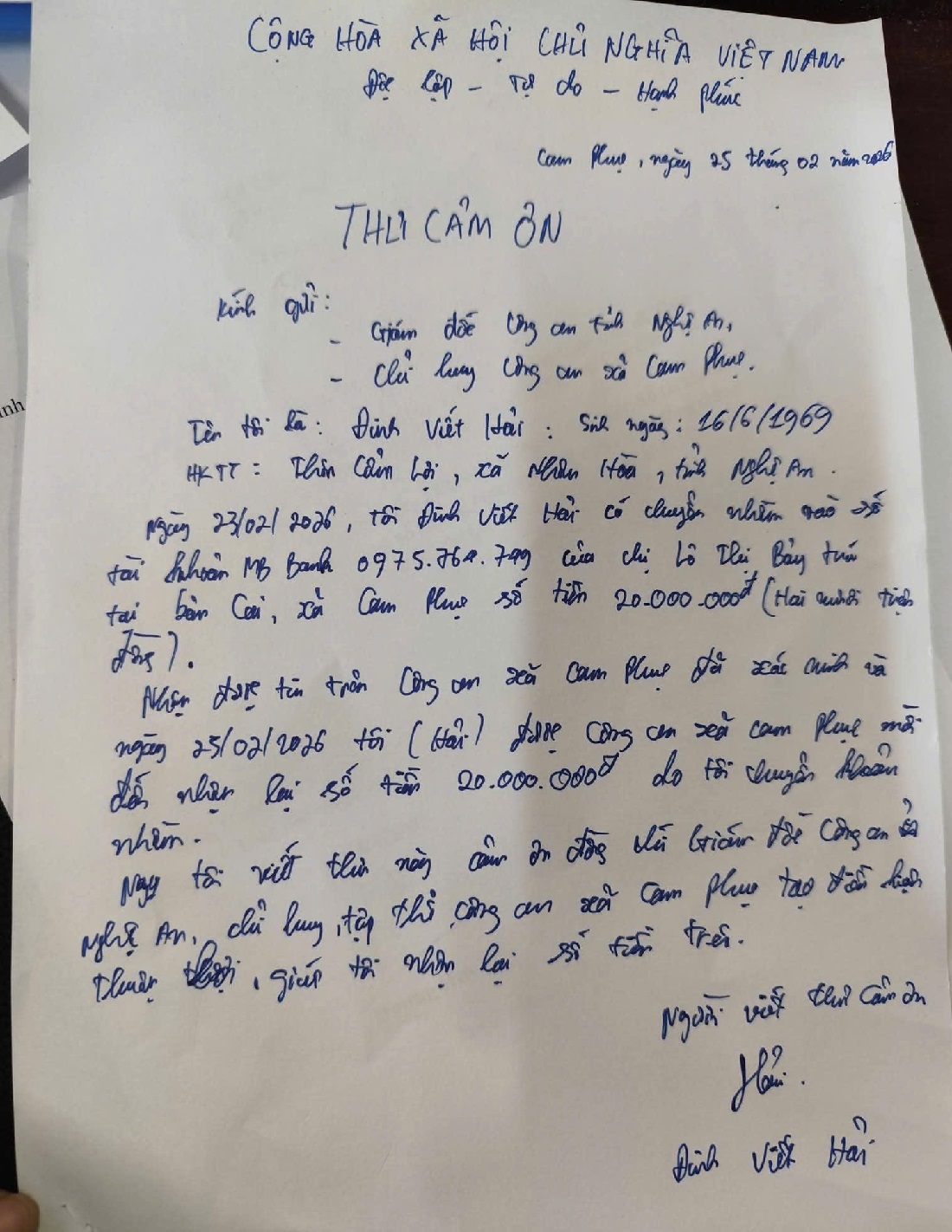 Với sự hỗ trợ tích cực của lực lượng Công an, đến ngày 25/02/2026, anh Hải nhận lại đầy đủ số tiền chuyển nhầm. Xúc động trước ý thức tự giác của chị Lô Thị Bảy và tinh thần trách nhiệm của Công an xã Cam Phục, anh Hải viết thư cảm ơn.